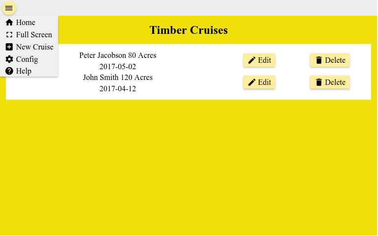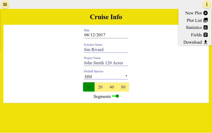 Collect forest inventory data offline on Android, IOS, Windows or any other platform that supports a modern web browser. Version 2.0 changes include: completely redesigned user interface, responsive design to optimize segment entry on tablets and fullscreen mode. Under the covers, jquery-mobile and knockout.js were replaced with newer technologies.